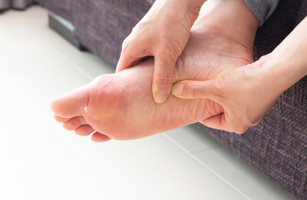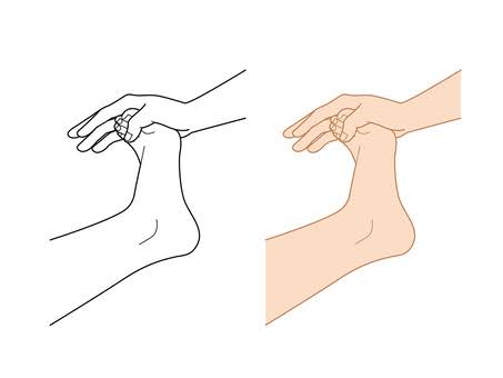 1. 手の親指を使い、土踏まずやかかとを押す。