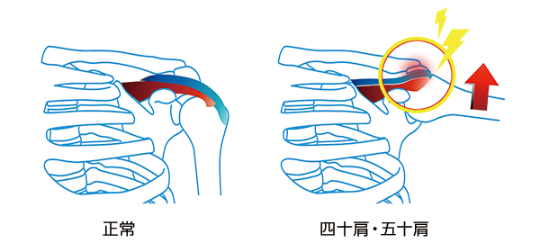 正式には「肩関節周囲炎」と呼ばれ、肩の関節周辺に炎症が起こることで、痛みや可動域の制限が現れます。40〜50代に多くみられることから、通称「四十肩・五十肩」と呼ばれています。