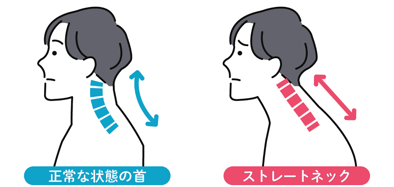 本来、首の骨(頚椎)は前方にゆるやかなカーブを描いています。しかし、スマートフォンやパソコンの長時間使用などで、首が前に突き出た姿勢が続くと、カーブがなくなり「ストレートネック」となります。